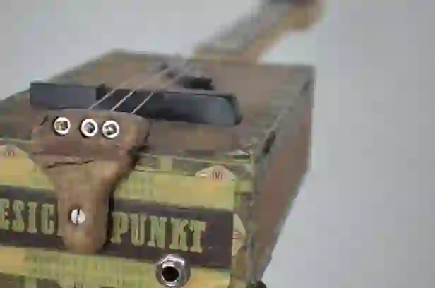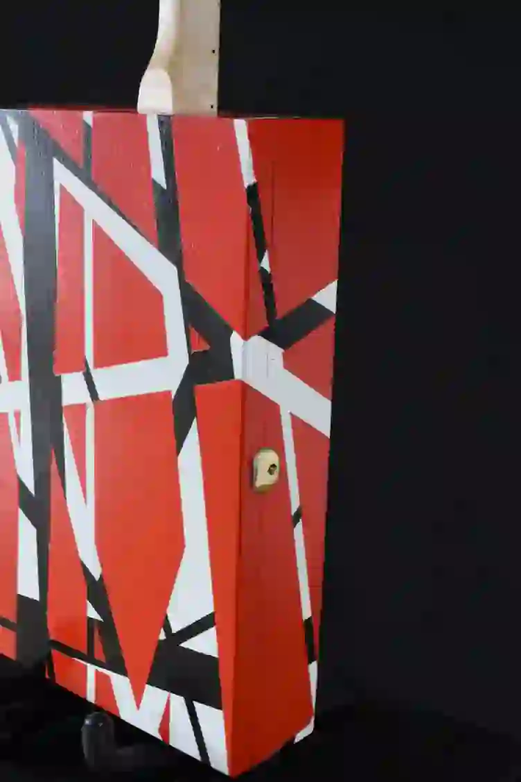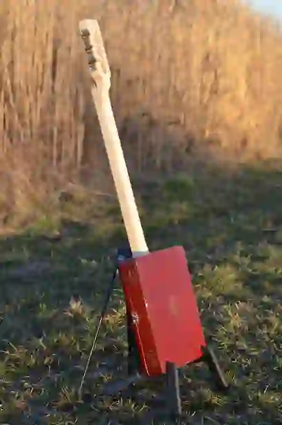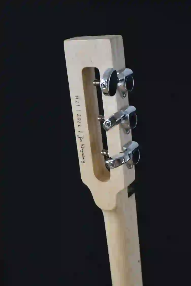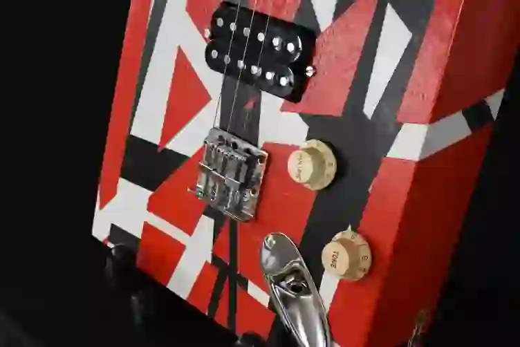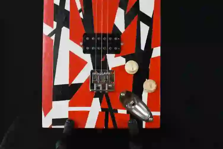 Mensur: 630 mm Halsholz: Ahorn, Tischplatte Tonabnehmer: Humbucker Schaltung: Volume-Poti + Tone-Poti Widmung: Eddie van Halen Bestandteil meiner 5er Serie Cigar Box Guitars, die angelehnt an berühmte E-Gitarren und berühmte Gitarristen sind.