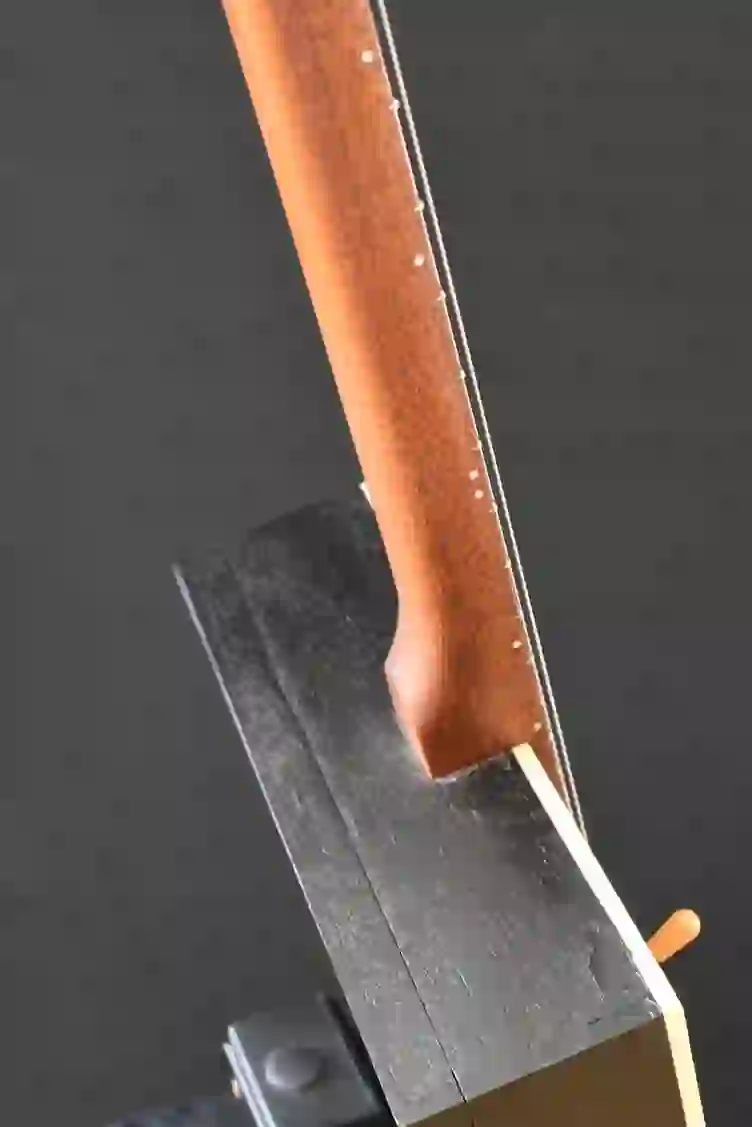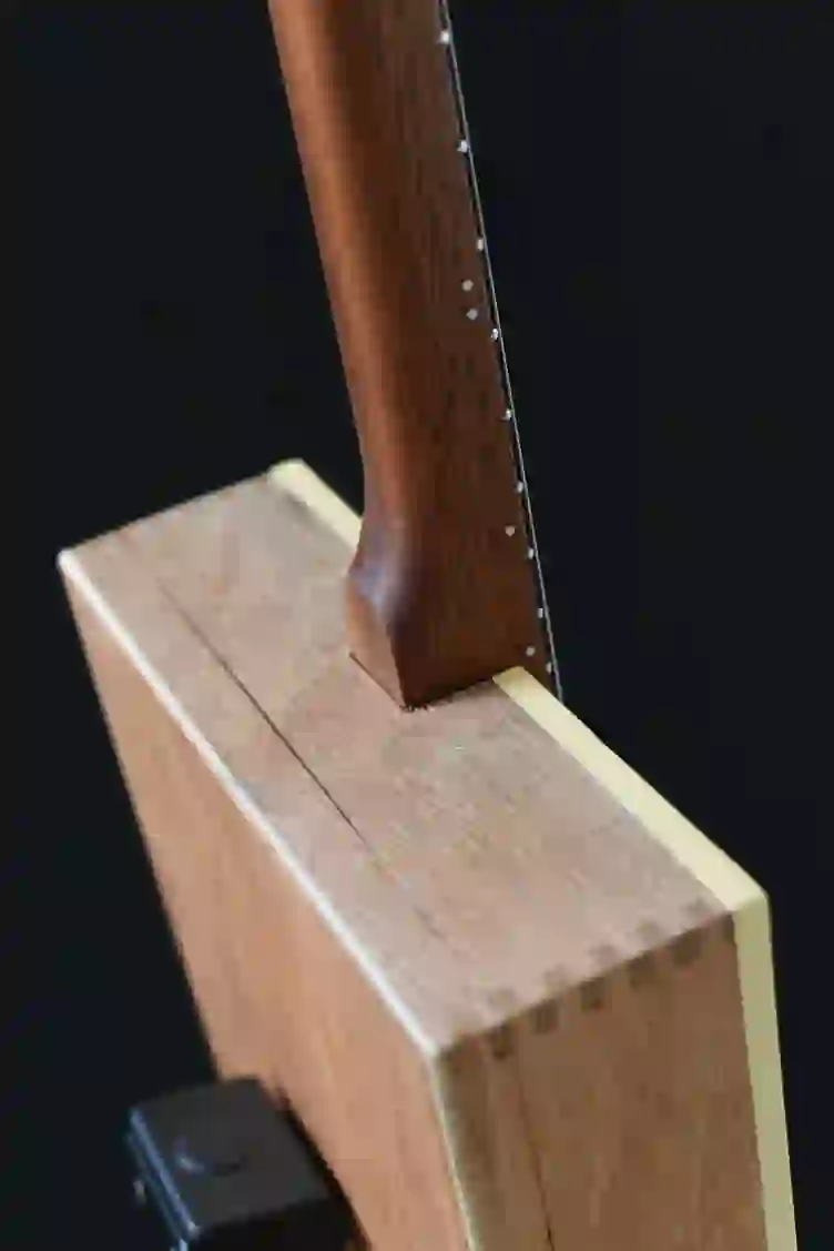 Mensur: 575 mm Halsholz: zweifarbige Walnuss aus Süddeutschland Tonabnehmer: Singlecoil
