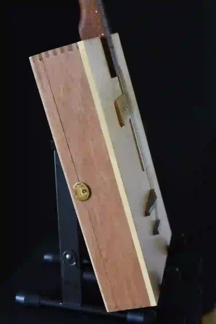 Mensur: 630 mm Halsholz: Mahagoni, Treppenstufe Tonabnehmer: Humbucker Schaltung: Volume-Poti Widmung: Freddie King Bestandteil meiner 5er Serie Cigar Box Guitars, die angelehnt an berühmte E-Gitarren und berühmte Gitarristen sind.