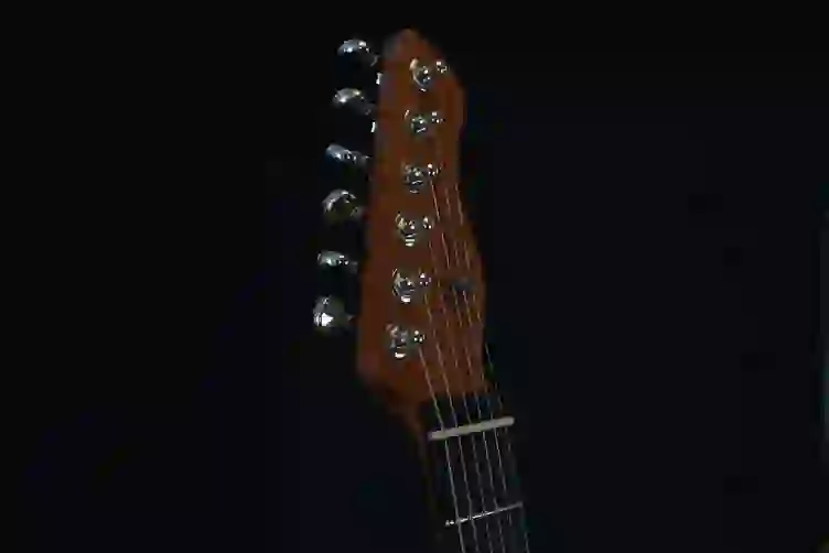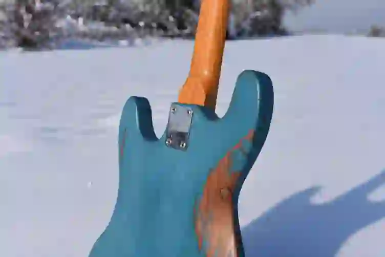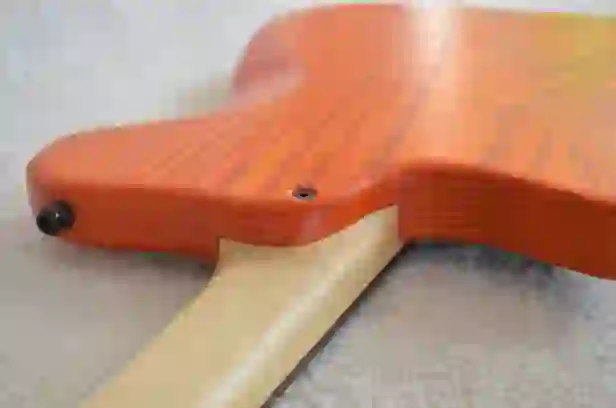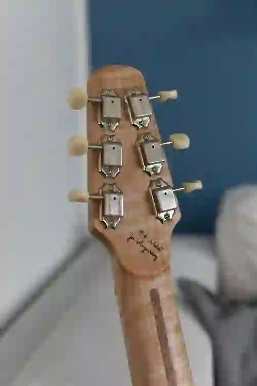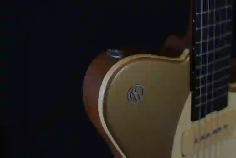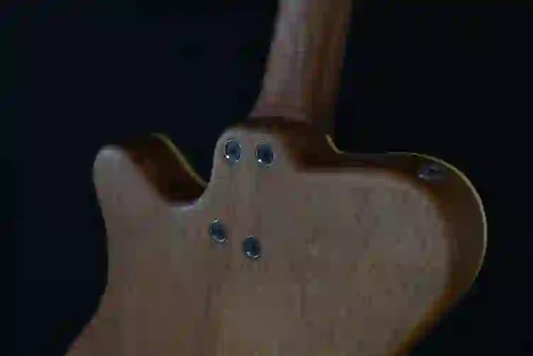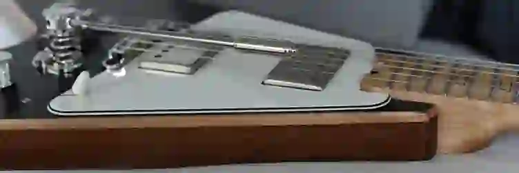 Das ist meine Interpretation eines zeitlosen Klassikers. An der Korpusform gibt es meines Erachtens nichts zu verbessern. Sie hängt toll am Gurt und ist sehr viel ergonomischer, als man denken würde. Ich wollte unbedingt einen einteiligen Ahornhals mit Skunkstripe verbauen. Dazu habe ich ein wunderschönes Stück Riegelahorn gefunden. Der Body besteht aus Treppenstufenmahagoni und bekam ein Binding aus dem Halsholz. Der Hals ist mit dem Body verschraubt, die Schrauben sind unsichtbar unter dem mit Magneten befestigten Schlagbrett. Dadurch entstehen ungewohnt saubere und aufgeräumte Oberflächen, die mir sehr gut gefallen. Der E-Fach-Deckel ist ebenfalls mit Magneten befestigt und aus dem Bodyholz gefräst, dadurch fügt er sich sehr unauffällig in das Gesamtbild ein.