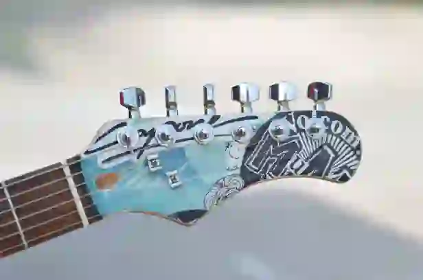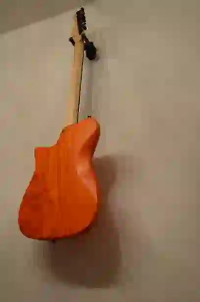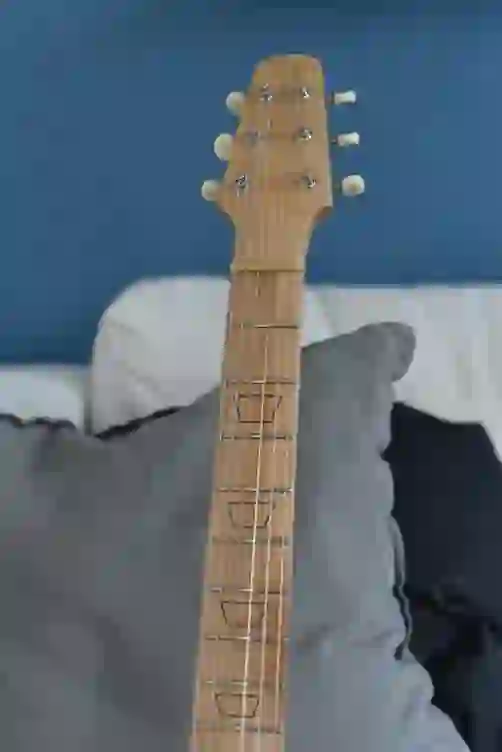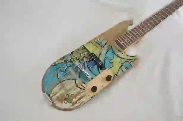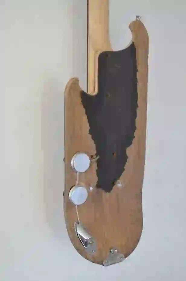 Der Auftraggeber für diese Linkshänder-Gitarre war jahrelang leidenschaftlicher Snakeboardfahrer und in seiner Jugend sogar Europameister. Aus einem alten Board durfte ich für ihn eine E-Gitarre bauen. Sie sollte zu seinem Musikstil (Punkrock) passen und möglichst viel Material aus dem alten Board "upcyceln". Das elektrische Konzept ist sehr einfach: Ein Humbucker am Volume-Poti und dann direkt zur Buchse. Sie ist sehr leicht und vor allem: Schön schlicht und rockig!