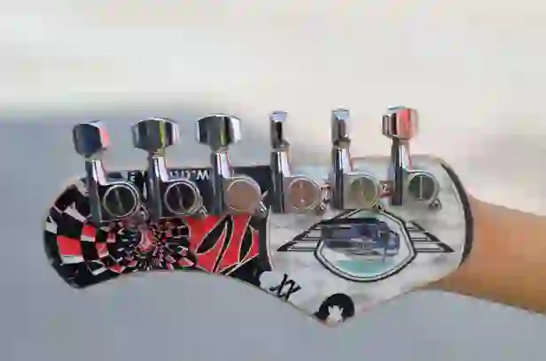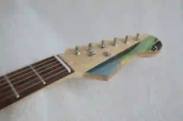 Mein ehrgeizigstes Projekt bis dato ist nicht umsonst die Jubiläumsgitarre mit der Nummer 10 geworden. Nach mehreren Jahren des Planens haben ich weitere fünf Jahre für den Bau gebraucht - natürlich mit großen Unterbrechungen und mehreren Zwischenprojekten. Die Grundidee bei diesem Entwurf besteht darin, eine wunderschöne Decke (diese Art von Holz war für mich tatsächlich der allererste Anreiz um mit Gitarrenbau anzufangen) soll nicht von den Tonabnehmer optisch unterbrochen werden. Deswegen verschwinden die Tonabnehmer unter der (sehr dünnen) Decke. Die Gitarre ist also quasi "semiakustisch". Die Elektronik wurde auch weitestgehend versteckt. Außerdem wollte ich dann noch die Fächerbünde (= "fanned frets") in Verbindung mit einer Fensterkopfplatte probieren. Durch großzügige Shapings wird der Korpus sehr handlich und liegt bequem an.