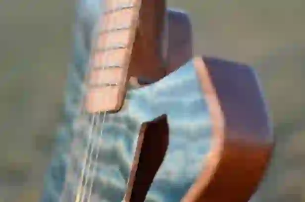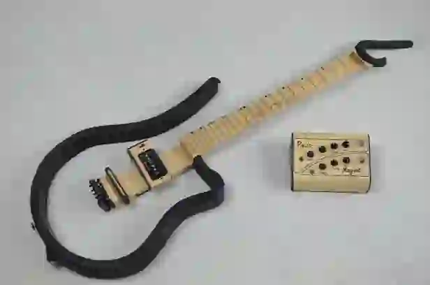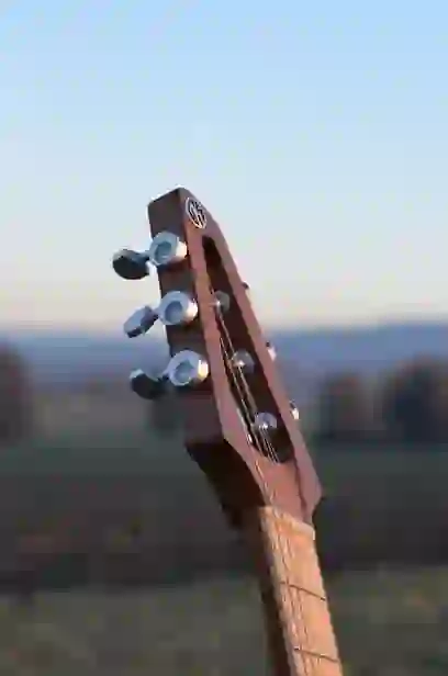 Das ist meine Reisegitarre. Die Saitenlänge (Mensur=630mm) ist normal groß, alles andere ist so klein und leicht wie möglich. Insgesamt wiegt die Gitarre nur 1.200 g und passt wirklich in jeden Koffer. Hals und Korpus sind aus einem Stück gefertigt. Die Gitarre klingt voll und mächtig, obwohl sie überaupt nicht danach aussieht. Sie hängt gut am Gurt und lässt sich so überall bequem spielen, auch auf dem Sofa und im Ohrensessel, weil man sie nicht auf dem Oberschenkel ablegen muss.