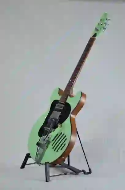 Eine ehemalige Framus Sorento aus den 70er Jahren, die der Vorbesitzer damals stark modifziert hatte, bekam ich geschenkt. Ein Rückbau in den Originalzustand wäre mit vertretbaren Mitteln nicht mehr möglich gewesen. Deswegen habe ich alle Löcher auf der Decke gefüllt und deckend lackiert. Die Kopfplatte habe ich verkleinert, ebenfalls lackiert und den laminierten Hals in mehreren Durchgängen in einem schönen Mahagoniton gebeizt und geölt. Die drei Tonabnehmer aus den 70ern funktionieren noch wunderbar und lassen sich jeweils einzeln schalten ("ein"/"aus"/"out of phase") und mit dem Mastervolume regeln. Der mittlere Bereich der Decke war großzügig ausgesägt und wird nun von einer zum Schlagbrett umfunktionierten Schallplatte verdeckt. Die außergewöhnliche Optik wird durch das Schalloch im Design alter Lautsprecher ergänzt.