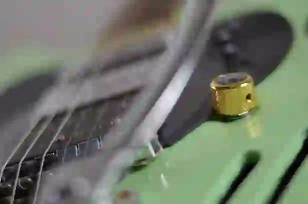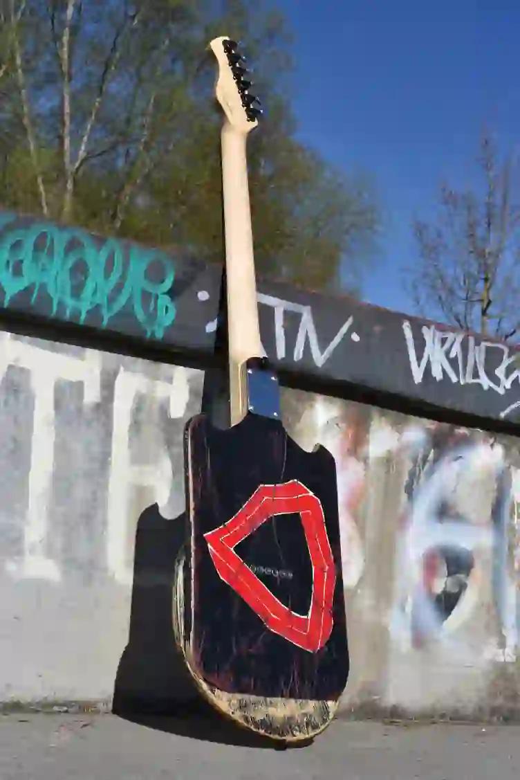 "Weniger aber besser" war der Grundgedanke bei der Konzepterstellung dieser Gitarre. Mit nur einem Tonabnehmer, einem Cutaway und einer Halsschraube hat sie alles was eine E-Gitarre braucht und wirkt dabei angenehm aufgeräumt. Der Kippschalter ermöglicht durch Zuschalten eines Kondensators eine zweite Sound-Option. Durch den ergonomischen Hals-Korpus-Übergang ist auch der 22te noch bequem zu erreichen, ohne mit dem Daumen umgreifen zu müssen. Das trapezförmige Halsprofil erleichtert das Greifen von Powerchords und unter dem Schlagbrett aus einer Schallplatte ist ein Plektrum-Reservoir untergebracht. Alle Komponenten sind von lokalen Zulieferern in Deutschland gekauft.