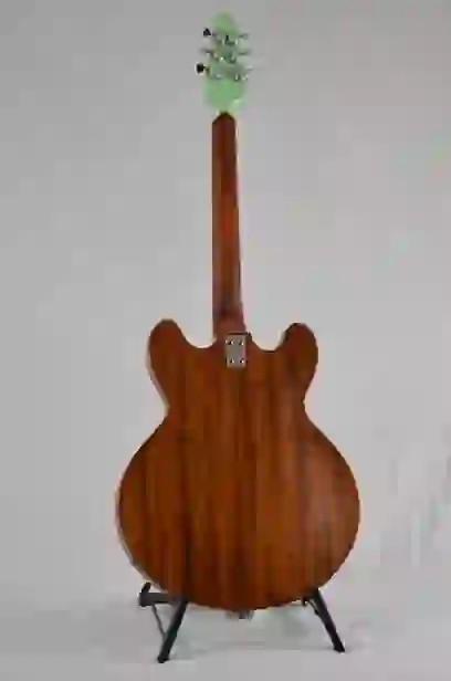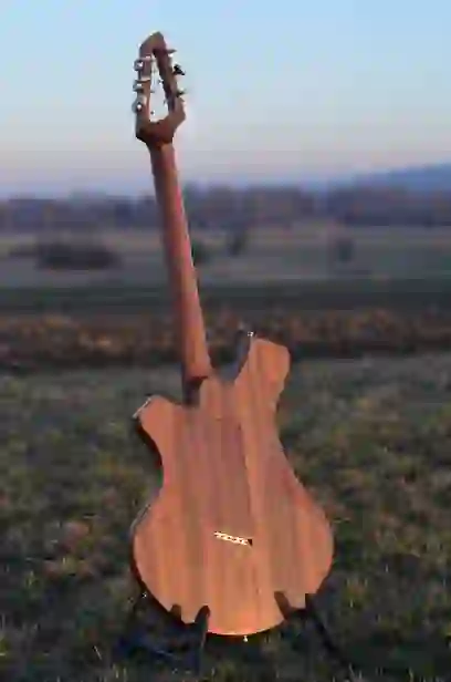 Diese Gitarre habe ich als angefangenes Projekt von einem anderen Gitarrenbauer übernommen und nach meinen Vorstellungen fertig gebaut. Ich wollte der Gitarre trotz der modernen und außergewöhnlichen Features, insgesamt einen "klassischen" Look verpassen. Sie ist semiakustisch aufgebaut, hat eine echte Fichtenholzdecke (wie bei Akustikgitarren) und ist recht handlich und angenehm im Sitzen und im Stehen zu spielen. Die beiden Tonabnehmer werden durch eine gemeinsam genutzte Dummycoil im E-Fach ergänzt. Alle drei Spulen sind von Rübezahl-Tonabnehmer gewickelt und wunderbar auf einander abgestimmt. An mehreren Stellen habe ich 3D-Druck-Teile aus Edelstahl verwendet, um die Gitarre mit durchdachten Details bei maximaler Gestaltungsfreiheit zu ergänzen.