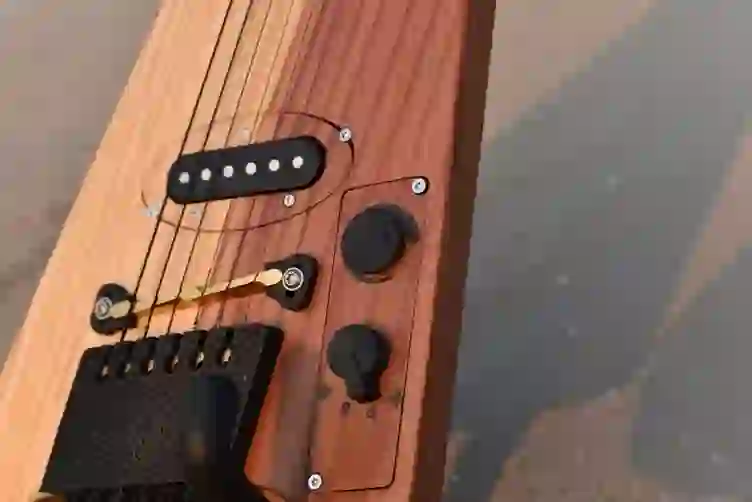 Holz: Ahorn (Hals), deutscher Mammutbaum (Korpus) Hals, Mechaniken, Schlagbrett, Tonabnehmer und Elektrik: vom Sperrmüll bzw. aus der Restekiste Brücke: Eigenbau, massives Messing, vernickelt