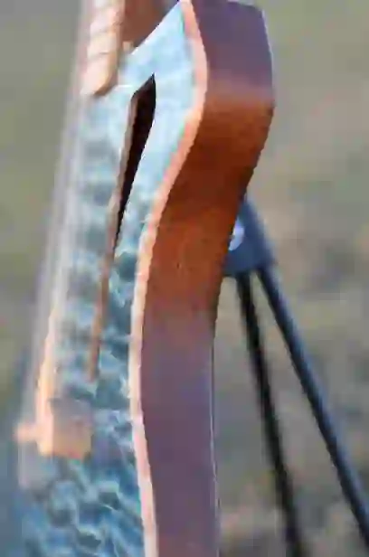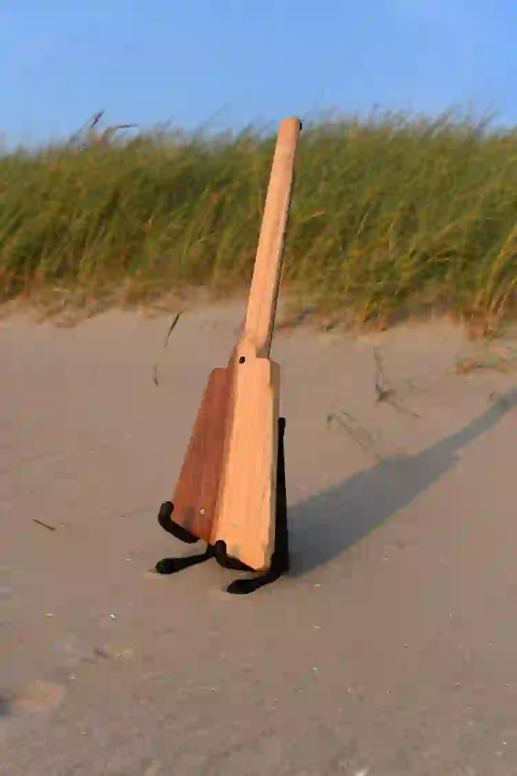 Der zweite Prototyp meiner Skateguitars. Einige Elemente habe ich vom ersten Prototyp übernommen aber auch einige Details noch optimiert. Das Formen der rückseitigen Wölbungen hat bei diesen kräftig gefärbten Furnierschichten besonders Spaß gemacht. Die Skateguitar ist wieder sehr leicht, sehr ergonomisch, kein bisschen kopflastig und klingt ordentlich nach Rock'n'Roll.