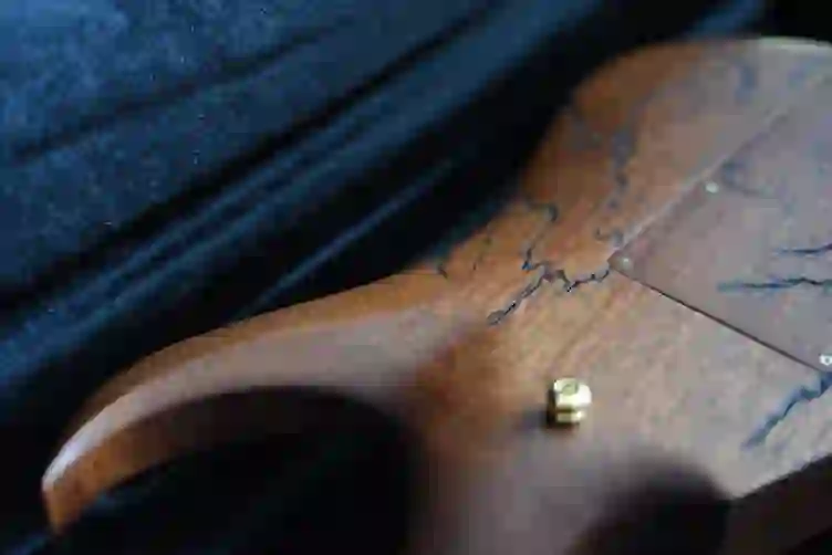 Holz: Mammutbaum aus Deutschland und schwarz gefärbter Bambus als Griffbrett Bridge + Tuner: Eigenentwurf aus massiven Messingteilen und industriellen 3D-Druck-Teilen Schaltung: 4-Wege-Schalter (Hals-PU | parallel | seriell | Bridge-PU) + Master-Volume