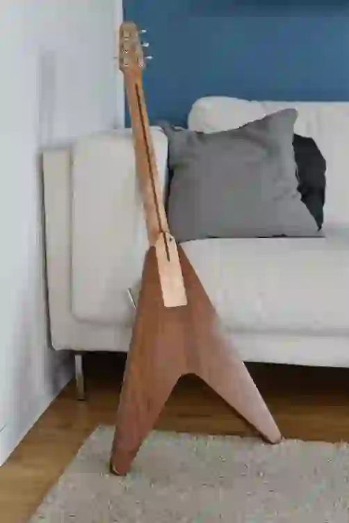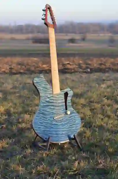 Diese Gitarre habe ich für und mit meinem Freund Lukas nach seinen Vorstellungen und Wünschen gebaut. Über ein Jahr lang haben wir uns regelmäßig getroffen, um weiter zu bauen. Er wollte gerne möglichst viele Arbeitsschritte selber machen und konnte sich vor allem bei den Entwürfen, beim 3D-Shaping und dem finalen Finish verwirklichen. Ein absolutes Highlight während dem Bauprozess waren die Lichtenberg-Figuren. Diese Strukturen haben wir mit etwa 2000V-Hochspannung in das Holz gebrannt. Diese Gitarre hat ein wirklich erstaunliches Sustain! Und welche Musik damit gemacht wird, kann man ihr wohl auch ansehen. Zusatztipp: Er stimmt sie meist auf "Drop C".