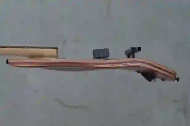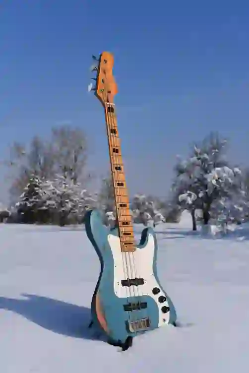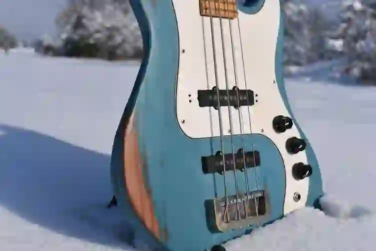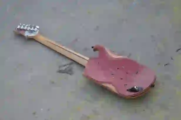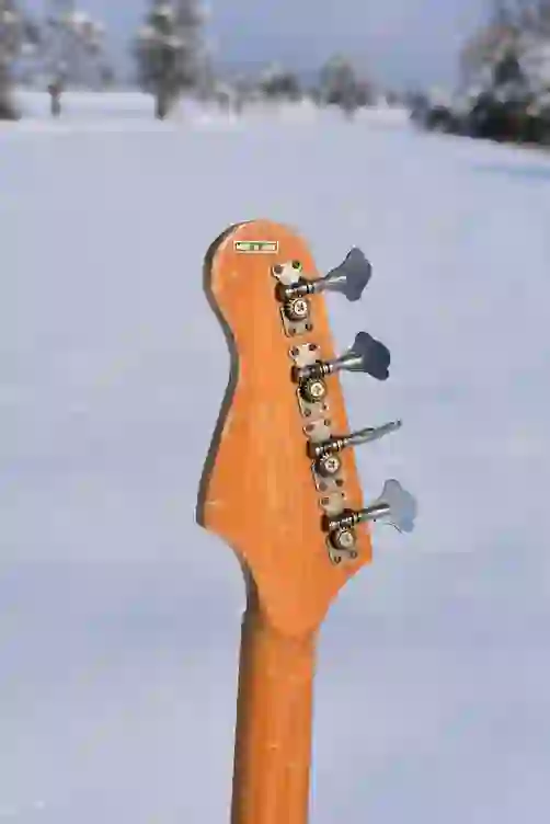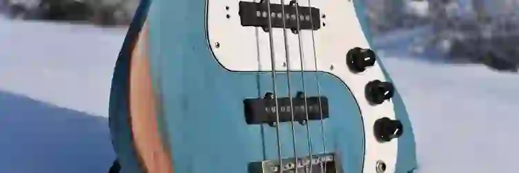 Ein Freund brachte mir eines Abends einen Bass vom Sperrmüll mit. Der Bass war ziemlich alt und kaputt. Aber ich entschied mich, ihn wieder herzurichten. Dazu habe ich einen neuen Korpus gebaut, denn der alte war aus einfachem Schichtholz hergestellt und mit einer langweiligen Sunburst-Lackierung versehen. Und den einfachen Blechwinkel an der Brücke habe ich durch eine massive, gefräste Messingschale ersetzt. Alle anderen Bauteile habe ich vom alten Stand übernommen. Der Bass hat eine sehr kurze Mensur und ist sehr leicht (wegen des leichten Korpusholzes) und kommt mir als Gitarrist also absolut entgegen.