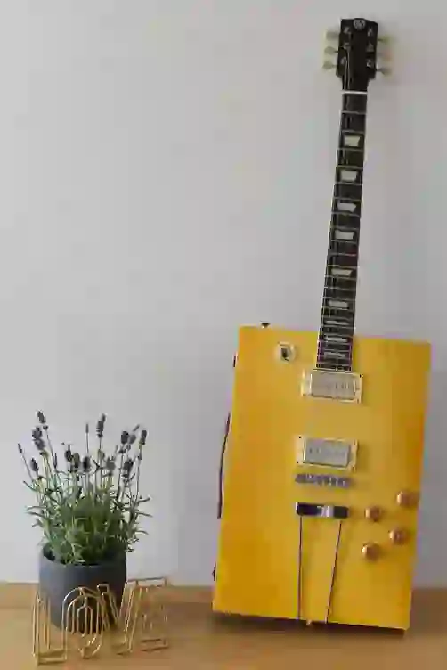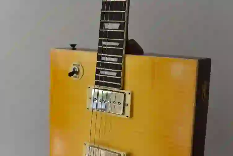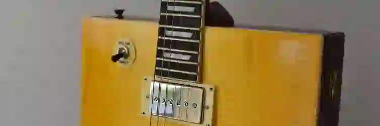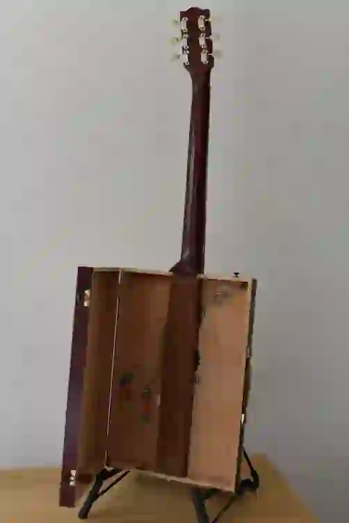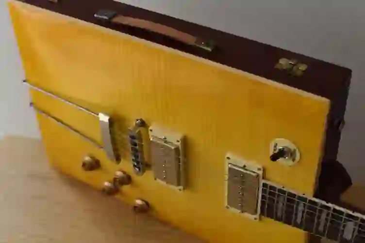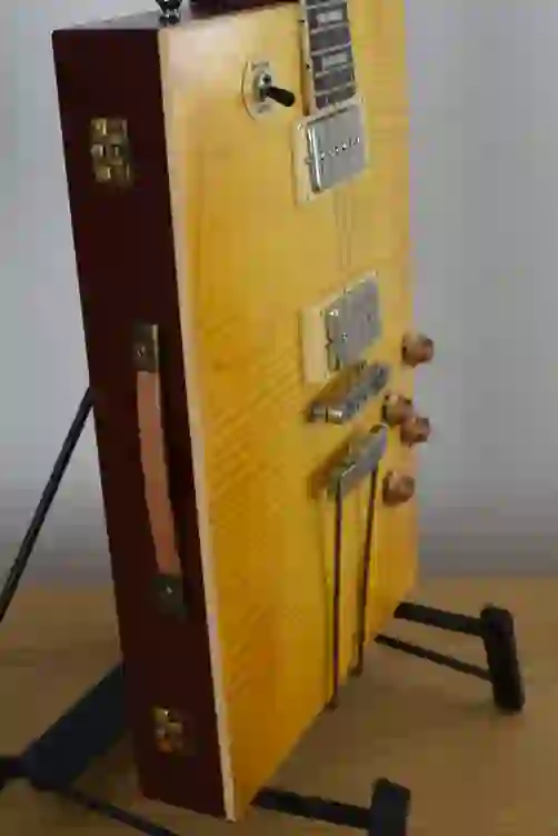 Schon lange wollte ich diese Idee verwirklichen. Als ich bei einem Gitarrenbauwettbewerb einen Les Paul-Bausatz gewann, war das die richtige Gelegenheit. Diese Gitarre besteht im Wesentlichen aus einer Buchenholzkiste vom Flohmarkt mit einer schönen Riegelahorndecke und dem Hals aus dem Bausatz. Sie zeigt alle klassischen Elemente der begehrten Les Pauls aus der frühen Ära der E-Gitarre und weicht nur in der Form des Korpus' deutlich vom Vorbild ab. Mir gefällt sie optisch sehr gut und sie ist auch nicht so unergonomisch, wie man auf den ersten Blick denkt. Sie klingt total klasse und macht auch als Lapsteel-Guitar eine gute Figur.