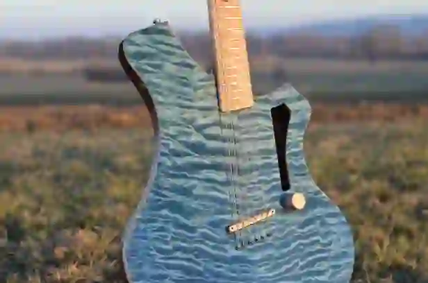 Holz: Ahorn (Hals), Palisander (Griffbrett), Riegelahorn (Korpusdecke), Buche (Korpus), Mahagoni (Halsblock) Tonabnehmer: Tonerider P90 Saitenhalter: Eigenbau
